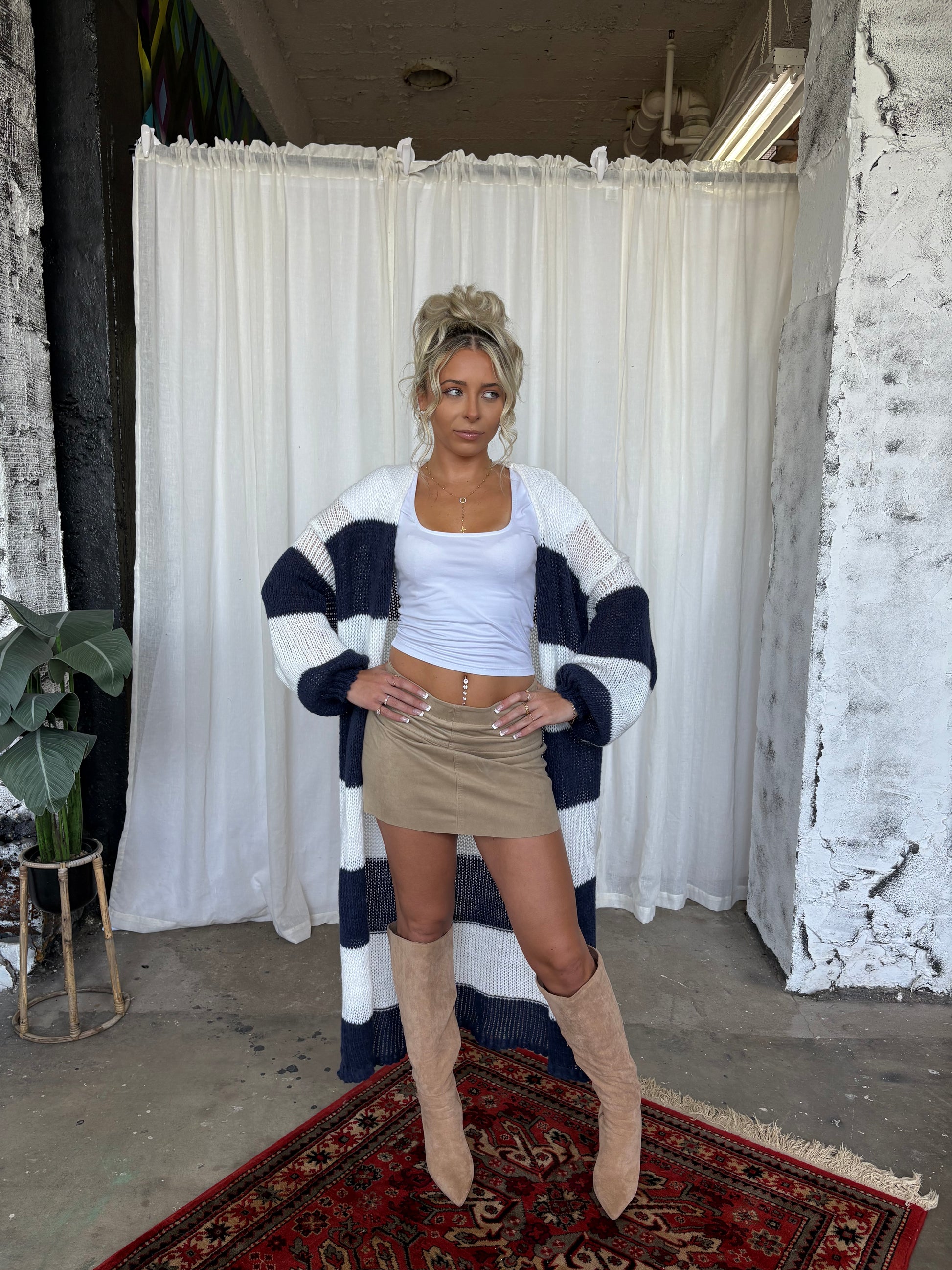 This navy and white stripe duster is giving laid back chic. Comfy enough to lounge in, cute enough to wear out, and the kind of piece that instantly upgrades any simple outfit.